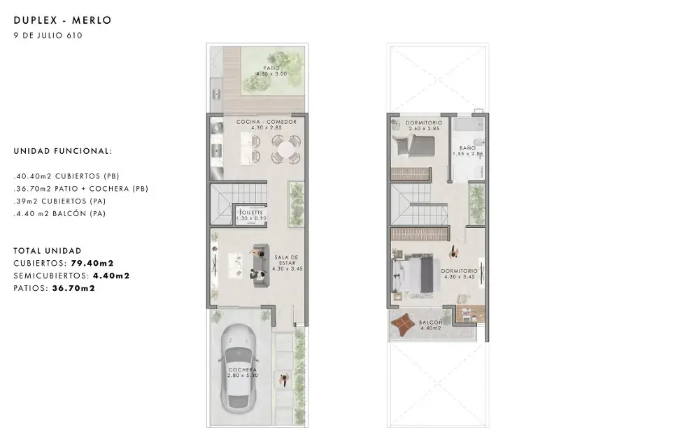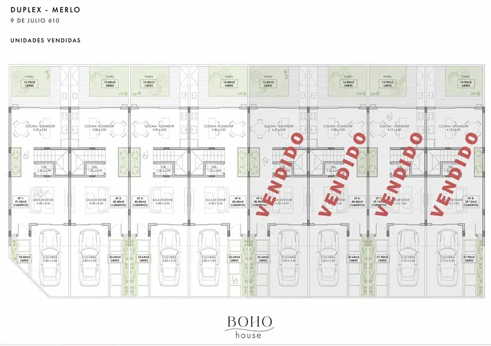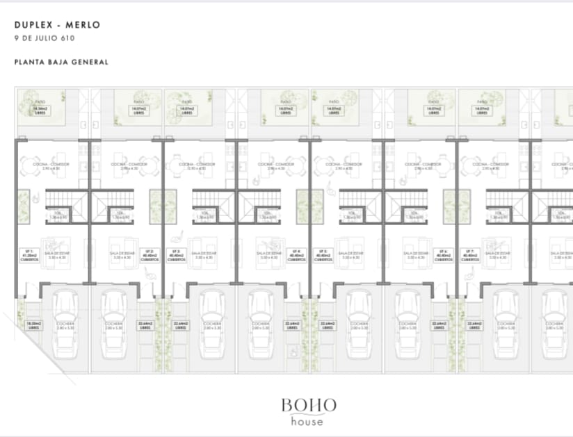 Deptos disponibles: UF 1: sup. Cubierta 81 M2, balcón 4.40 M2, patio 14.34 M2, cochera 18.50 M2. Total: 118,24 M2 Las UF 2, 3 y 4: Sup. Cubierta 79.40 M2, balcón 4.40 M2, patio 14,04 M2 y cochera 22,64 M2. Total: 120,61 M2.