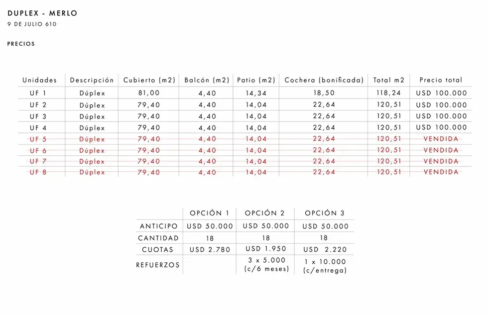 3) Anticipo u$s 50.000, 18 cuotas de u$s 2.220 y un refuerzo de u$s 10.000 contra entrega.